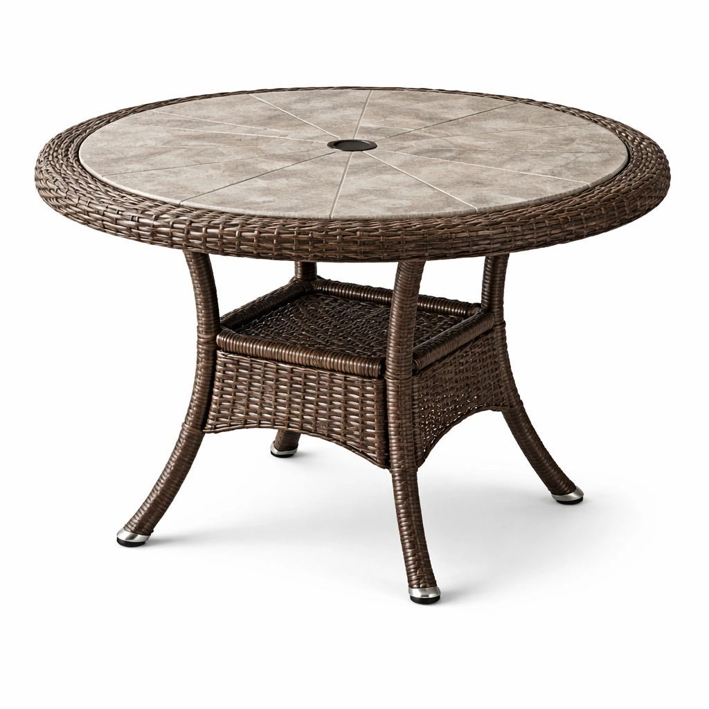 Mesa de comedor exterior redonda de mimbre sintético y cerámica