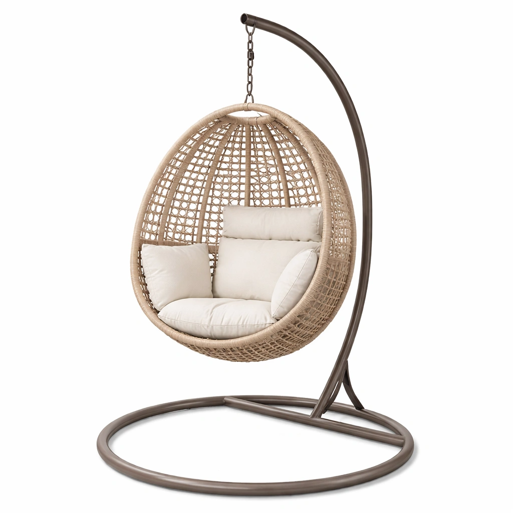 Silla colgante de ratán sintético azul con estructura metálica negra