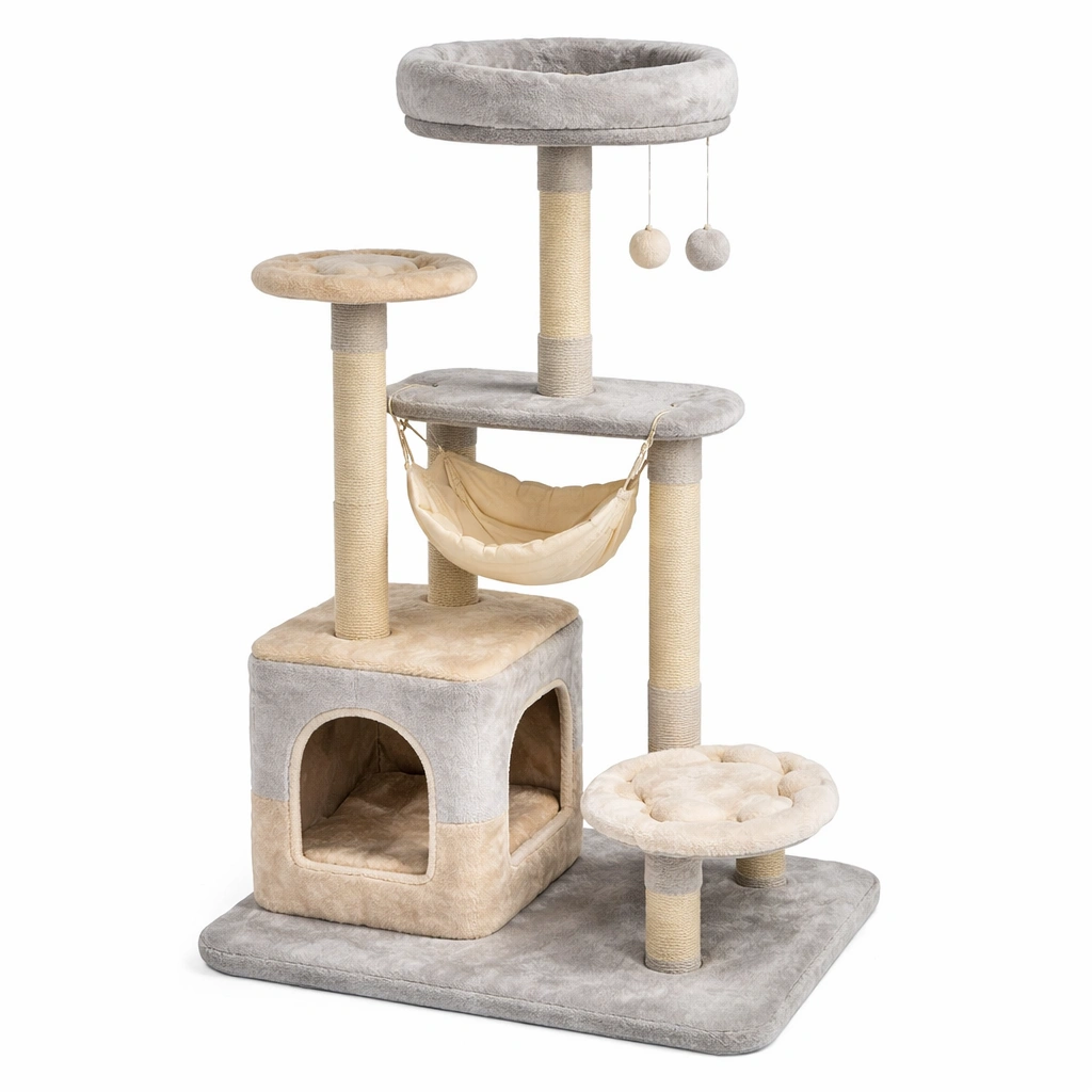 Características: estructura de cinco niveles, hamaca de tela, plataformas acolchadas, cueva para descanso, juguetes colgantes de felpa.